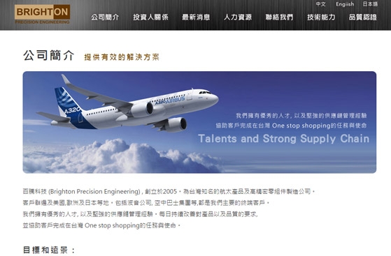 百騰科技 (Brighton Precision Engineering) , 創立於2005。為台灣知名的航太產品及高精密零組件製造公司。每日持續改善對產品以及品質的要求。